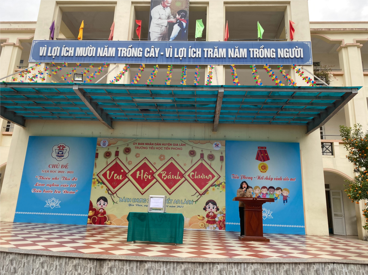 Cô Vũ Thị Thủy -Tổng phụ trách nhà trường phát động phong trào quyên góp quyên góp quỹ đền ơn đáp nghĩa, quỹ Bảo trợ trẻ em