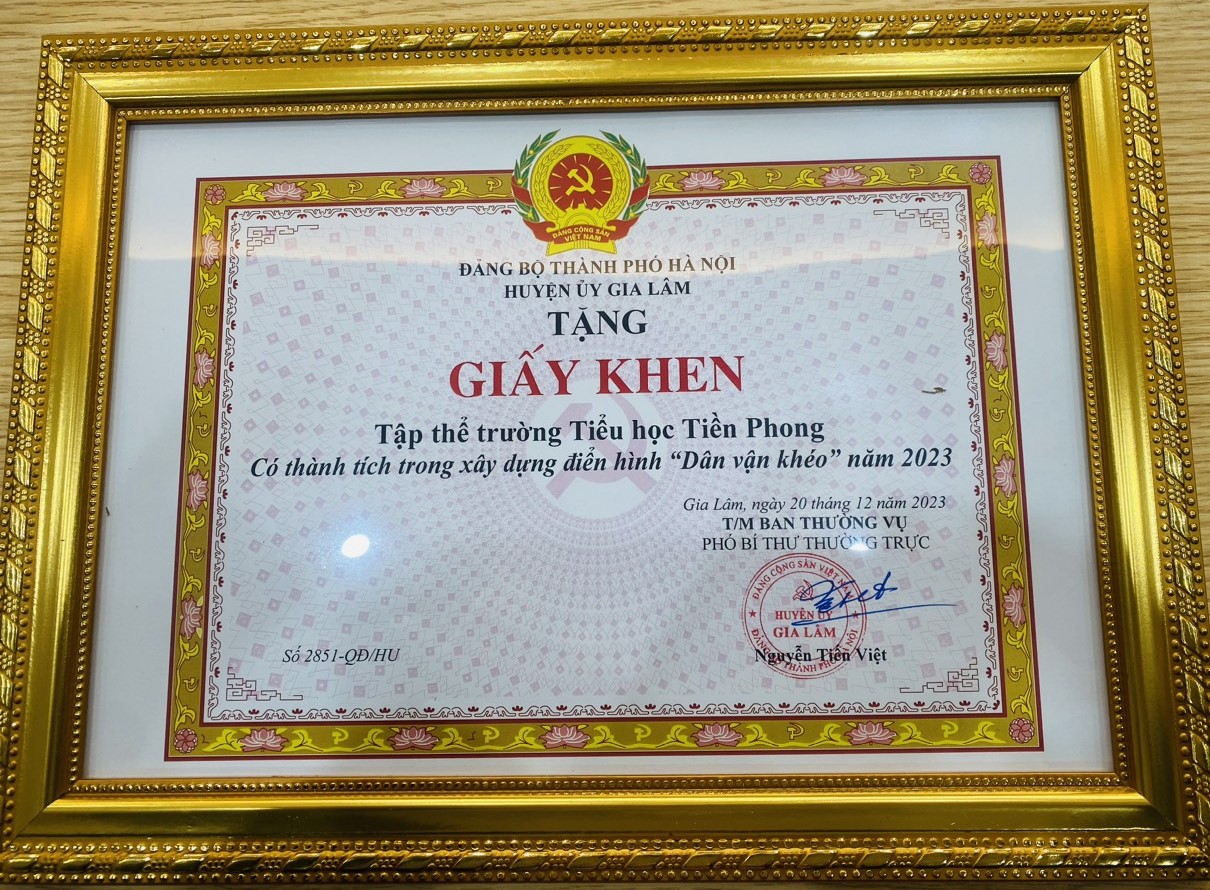 Sáng 29-1, Huyện ủy Gia Lâm tổ chức hội nghị tổng kết phong trào thi đua “Dân vận khéo” năm 2023, phát động phong trào thi đua năm 2024; ký kết Chương trình phối hợp về công tác dân vận năm 2024. Trong hội nghị, trường Tiểu học Tiền Phong đã được Huyện ủy Gia Lâm khen tặng về phong trào thi đua "Dân vận khéo" trong nhà trường.